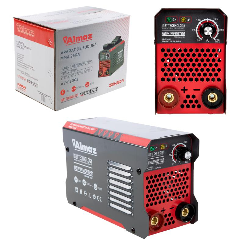 Almaz 250A este un aparat pentru sudura monofazat, tip invertor, recomandat in special pentru sudarea cu electrozi inveliti in curent continu, prin procedeul MMA (Manual Metal Arc). Cu acest aparat de sudura Almaz sudati cu success toate tipurile de electrozi inveliti (electrozi rutilici, electrozi bazici, electrozi inox etc.) o gama diversificata de materiale cum ar fi otel aliat si nealiat, otel inoxidabil, fonta, aluminiu, cupru, etc